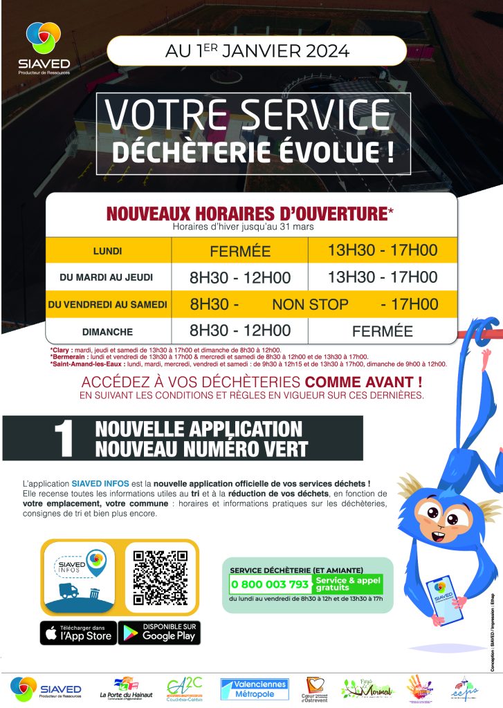 A compter du 1er janvier 2024, ce service sera assuré par le SIAVED (Syndicat InterArrondissement de Valorisation et d’Élimination des Déchets) qui deviendra votre interlocuteur unique pour les questions liées à la collecte, au tri et au traitement de vos déchets ainsi que sur le fonctionnement des déchetteries.