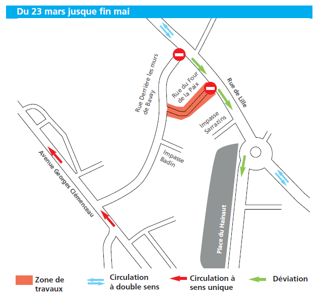 - La circulation est interdite dans la rue du Four de la Paix (24/24h), et également dans la rue Derrière les murs de Bavay (uniquement de 9h à 16h).