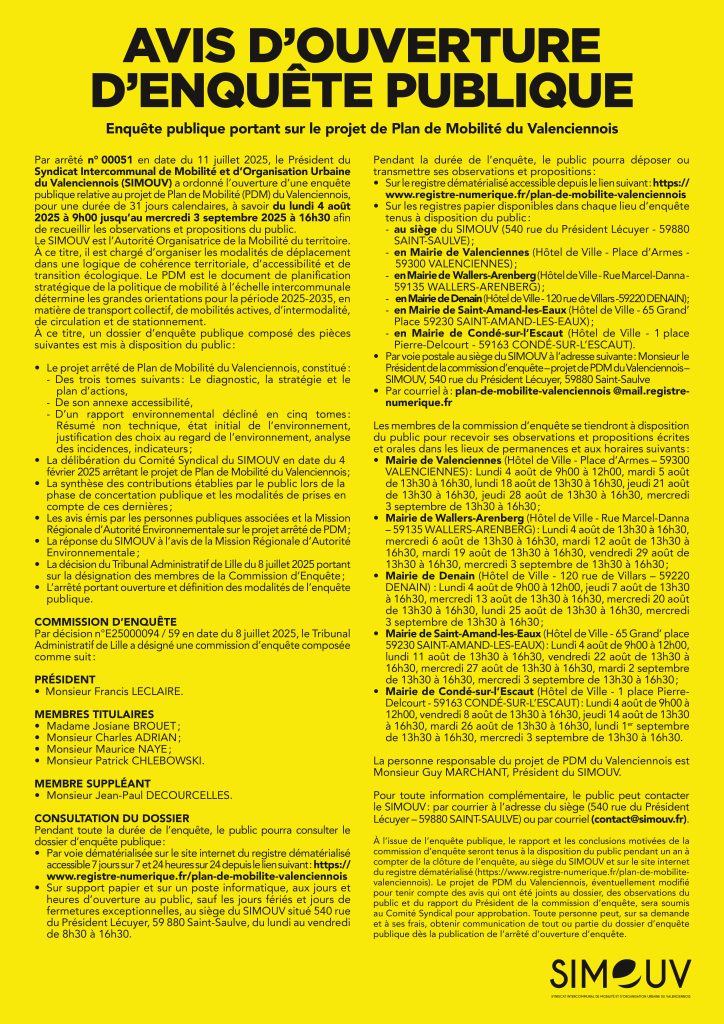 Par arrêté n° 00051 en date du 11 juillet 2025, le Président du Syndicat Intercommunal de Mobilité et d’Organisation Urbaine du Valenciennois (SIMOUV) a ordonné l’ouverture d’une enquête publique relative au projet de Plan de Mobilité (PDM) du Valenciennois, pour une durée de 31 jours calendaires, à savoir du lundi 4 août 2025 à 9h00 jusqu’au mercredi 3 septembre 2025 à 16h30 afin de recueillir les observations et propositions du public.