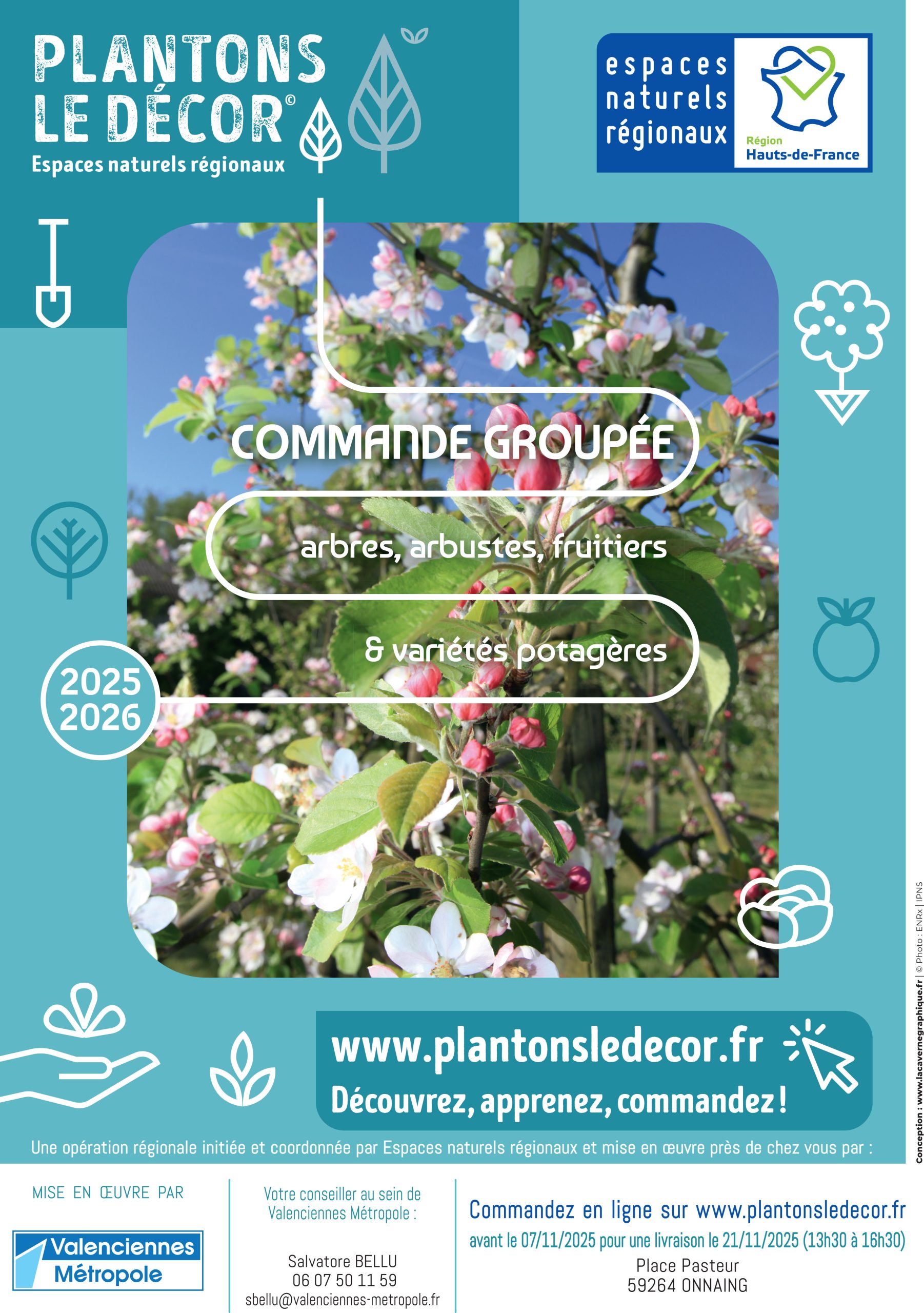 « Plantons le décor » est une opération de commandes groupées d’arbres, d’arbustes et de variétés fruitières et légumières d’origine locale en partenariat avec 11 producteurs-fournisseurs régionaux et 31 territoires en Hauts-de-France dont Valenciennes Métropole.