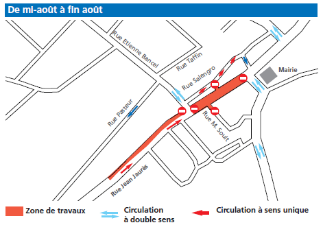 Les travaux de voirie débuteront le 12 mai avec la fermeture du tronçon allant de la mairie au croisement avec la rue Etienne Bancel (voir plan). Le carrefour Bancel et la place Vaillant-Couturier resteront ouverts pendant la durée de cette phase.