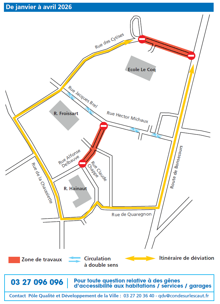 Les travaux de la rue Hector Michaux se poursuivront jusque la fin de l’année, ceux de la rue Delbauve commenceront en janvier 2026 et le chantier de la rue Bonsecours interviendra après celui de la rue des cytises qui débutera lui aussi en janvier 2026.