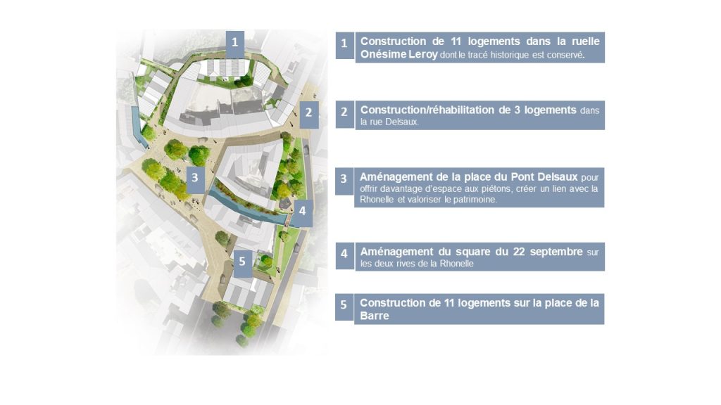 - Les travaux d’aménagement des espaces publics finalisés en décembre 2024 : la ruelle Onésime Leroy, la place du pont Delsaux, le square du 22 septembre, une partie de la place de la Barre.