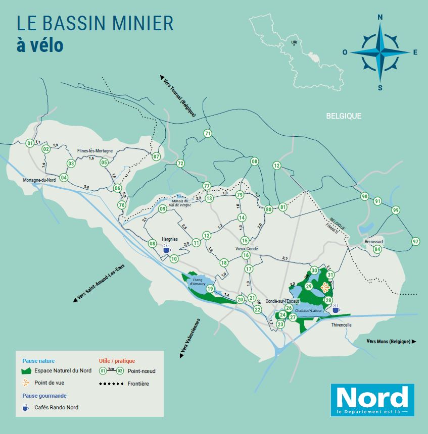 Le Département du Nord poursuit le développement des réseaux points-nœuds vélo avec les premiers itinéraires du réseau points-nœuds Bassin minier autour du site de Chabaud-Latour à Condé-sur-l’Escaut et de l’étang d’Amaury à Hergnies. 400 panneaux et 35 carrefours points-nœuds sont d’ores et déjà posés pour découvrir ces espaces naturels d’exception situés sur d’anciennes friches minières.